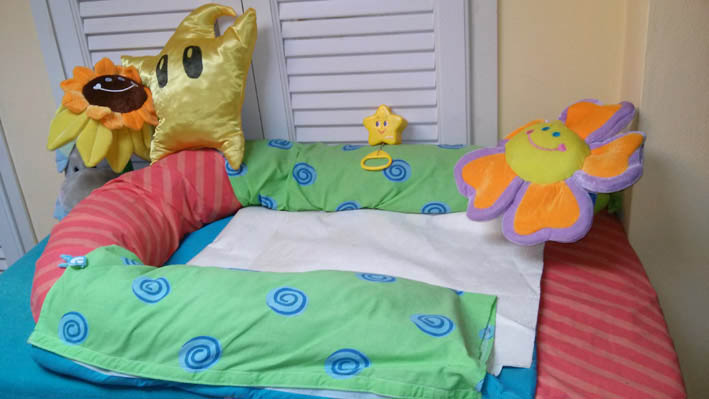 Ah!.... meglio usare anche un pezzo di stoffa impermeabile ( come quello bianco che vedete in foto), che potra' servire anche nella fase di spannolinamento da mettere sotto le lenzuola ;) .