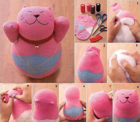 Qunte volte vi è successo di rimanere con i calzini spaiati? Beh a me davvero tante, a volte penso che dentro la lavatrice esista un mondo fatto di calzini...dove vadano a finire per me è veramente un mistero. Potrete reciclare i più carini trasformandoli in un bell' animaletto. Inoltre può essere un' idea regalo (comprando un paio di calzini nuovi ovviamente) visto che oggi se ne trovano anche a pochissimo, in questo modo risparmierete ;) Quì viene proposto un bel gattino ma potrete usare la fantasia per fare molti altri personaggi. Il sito da cui ho preso questa idea è Prakticideas.com Avrete bisogno dei seguenti materiali: - Imbottitura - forbici - bottoni e filati (per la decorazione) - calze - Filo e ago - Penna per tessuto Istruzioni: Taglia la calza alla lunghezza desiderata. Il passo successivo è quello di riempire il corpo e la testa del piccolo gattino con l'imbottitura. Bisogna stare attenti che la parte del corpo sia più grande della testa. Dopo aver terminato questa fase, piega l'apertura del calzino leggermente verso il basso (Fig.5), chiudi l 'apertura con il filo e non dimenticare di tirare le estremità per formare le orecchie del gattino. Forma il corpo e la testa con le mani per dare loro una forma rotonda. |